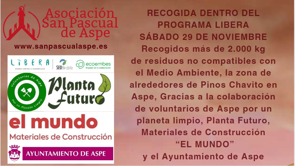 ¡Apúntate a luchar contra la basuraleza en caminos y zonas verdes de Aspe, en colaboración con la Asociación San Pascual de Aspe, Planta Futuro y Voluntarios de Aspe por un planeta limpio y con Ayuntamiento de Aspe dentro del proyecto LIBERA! SABADO 29 NOVIEMBRE 16:00h ¡apúntate!